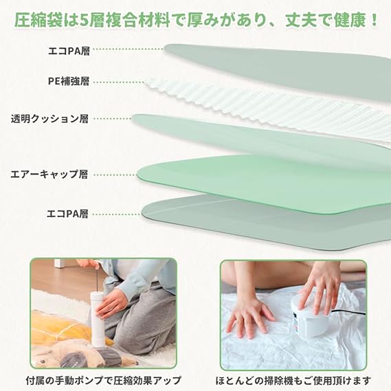 - 【健康的で無汚染な安全材質】この衣類圧縮袋はPA + PEの5層複合材料を採用されており、健康的に柔らかくて耐久性に優れています。アルデヒド無し、使用中に衣類に損傷しなく、衣類、布団の安全保管に、より長期間の保存と再利用ができます。