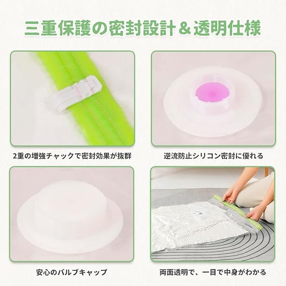 - 【空気漏れ防止完全な気密性】二重チャック、逆流防止ゴムとバルブキャップの三重構造逆止弁で空気の逆流をしっかりと防ぎ、抜けた空気が戻らないことにより、真空状態が長く続くのです。この特徴により、衣類圧縮や旅行用の圧縮などの貴重なアイテムをしっかりと保護することができます。