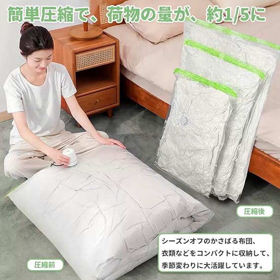 - 【80%スペースを省く圧縮袋】クローゼットにいっぱいつまった季節外れの衣類を一気に整理整頓し、収納できます。衣替えの時に非常に役に立てます。布団、衣類、おもちゃ、衣類、寝具、家庭用品、旅行物、メイクアップなどをもまとめて80%スペースを圧縮して、荷物の嵩も減ります。家庭、旅行、出張、引越しで最適です!
