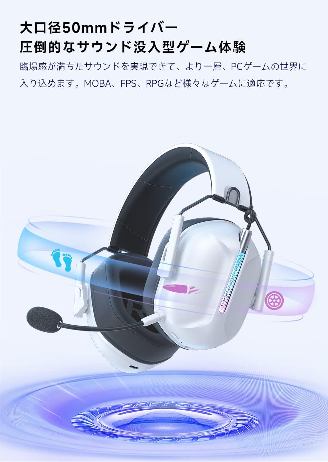 • 【大口径50mmドライバー&圧倒的なサウンド】 こちらのゲーミングヘッドセットは大口径50mm強磁力ネオジウムマグネットドライバーに基づいて、クリアな高中音域、強力な重低音まで再生し、臨場感が満ちたサウンドを実現できて、より一層、PCゲームの世界に入り込めます。 3Dサラウンドサウンドによって、音の立体感を高め、コンサート現場にいるかのような繊細な音楽や、ゲームの世界に入り込んだ様な大迫力な銃声や爆発音を再現します。 くっきりとした音像定位や、明確な方向感の再現を重視した高音質のヘッドセットで、様々なゲーム(例えばMOBA、FPS、RPG、荒野行動など)に適応です。