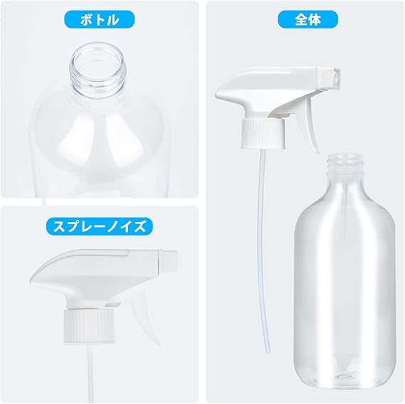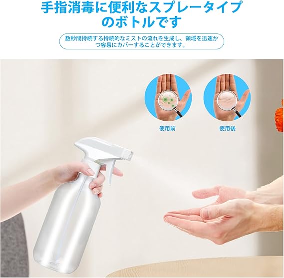 大容量500ml 3個セット 大容量で、消毒液の補充やお手入れが簡単に出来ます。詰め替えれば様々な用途で使われています。除菌用アルコール、消毒液、化粧品、ヘアスプレー、スキンケア、抗菌液、園芸用霧吹き、消臭剤などの液体も本商品を使いできます。洗いやすいので何度も再利用でます。