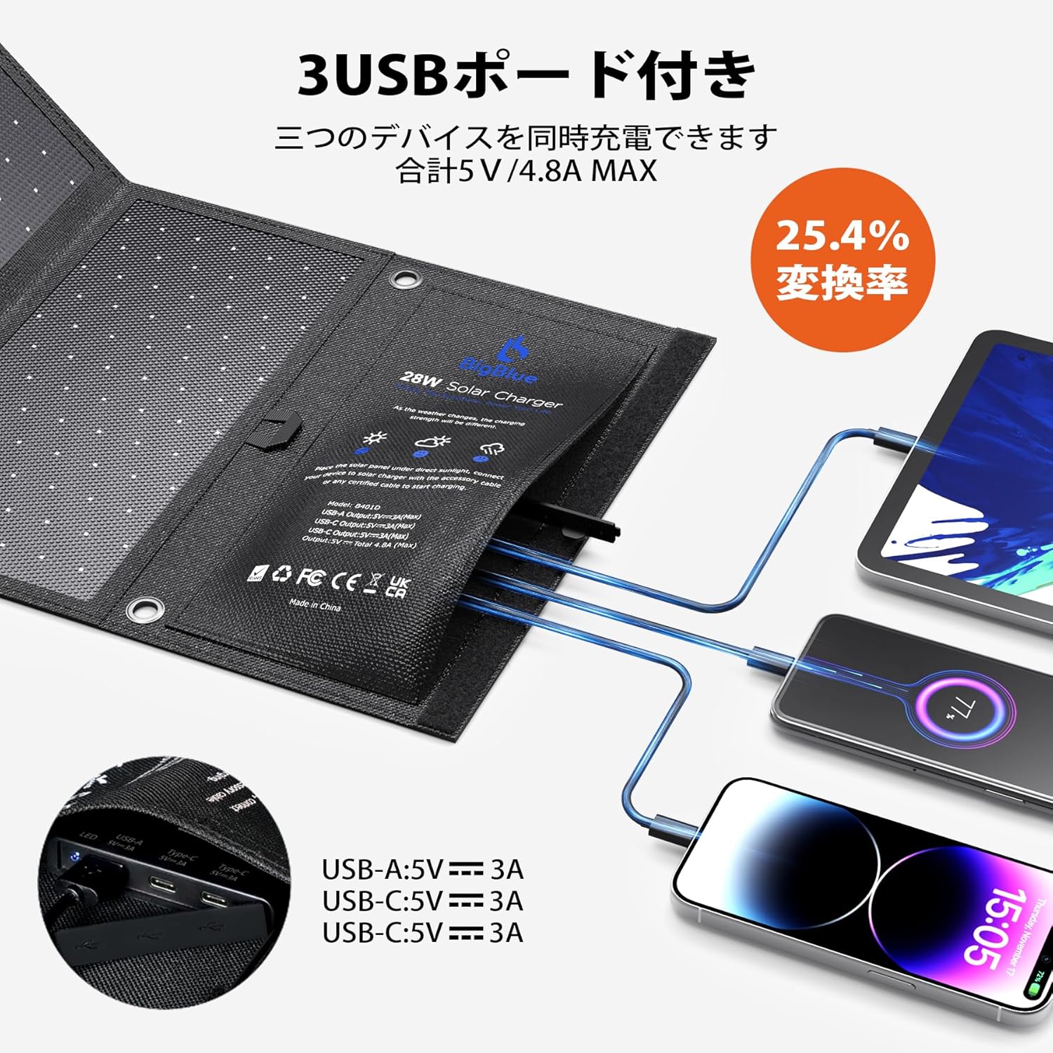 【ご注意:本製品は充電には直射日光が必要で「モバイルバッテリー付属」と勘違ってないでください。】【Smart IC技術とオートリトライ機能】BigBlue独自Smart IC技術により、各USBポートは接続されたスマホなどを自動的に検知し、最適な電流で急速充電を行います。オートリトライ機能とはデバイスへ充電する時、雲りで発電量が下がると天気が回復して発電量が自動的に增えることができます。晴れと曇りに相互変わるときにソーラー充電ケーブルを設置する必要がなく、自動的に充電を再スタートします。 軽量でよりポータブルな構造を採用したことにより距離旅行や登山、キャンプ、 ハイキング、BBQなどのアウトドアに最適なつくりとなっております。地震 ・ 災害時にも非常用電源としても大活躍!