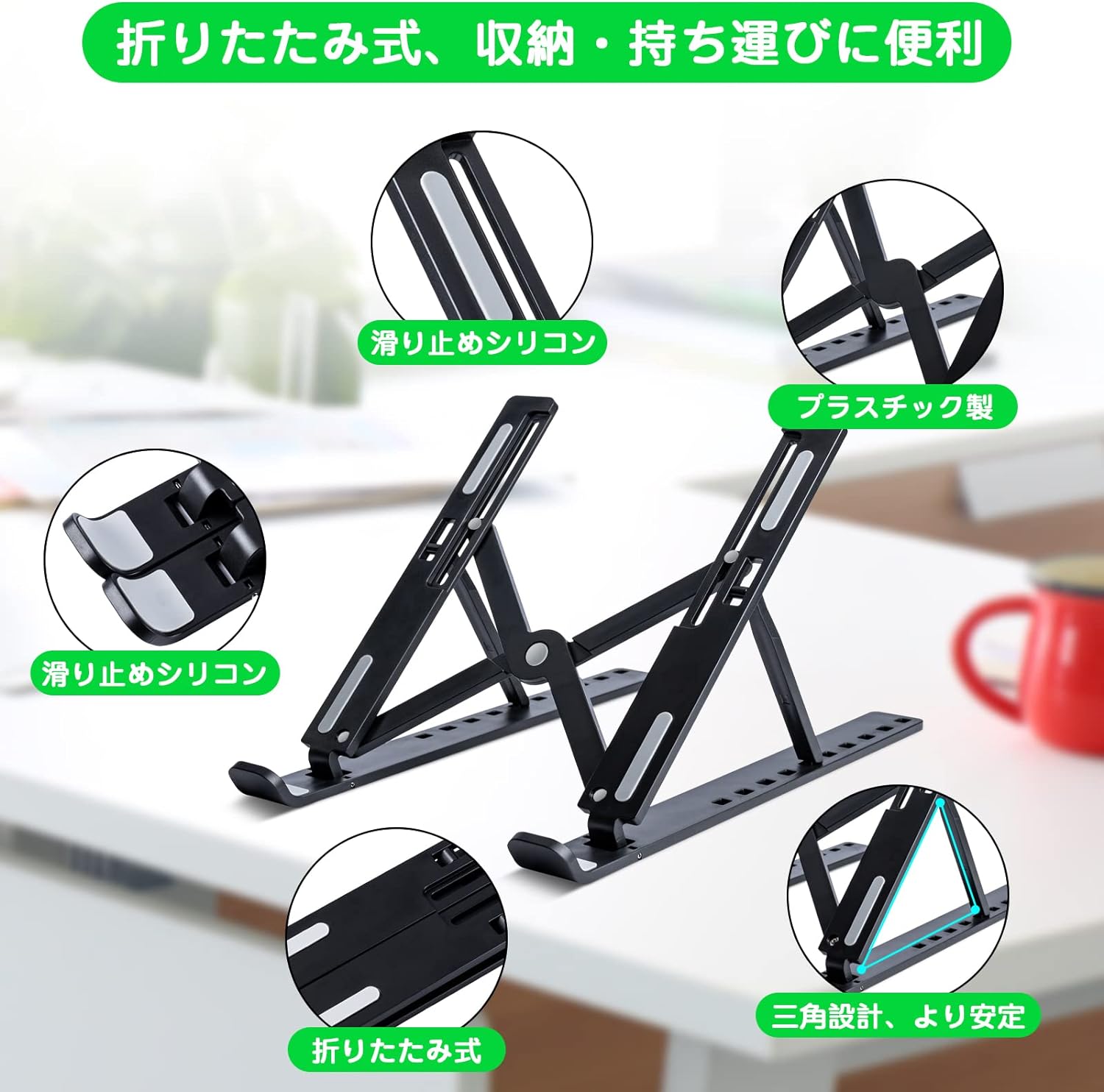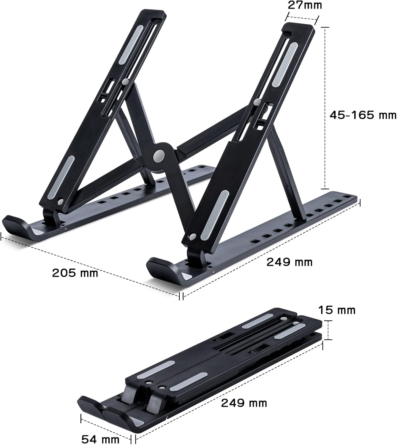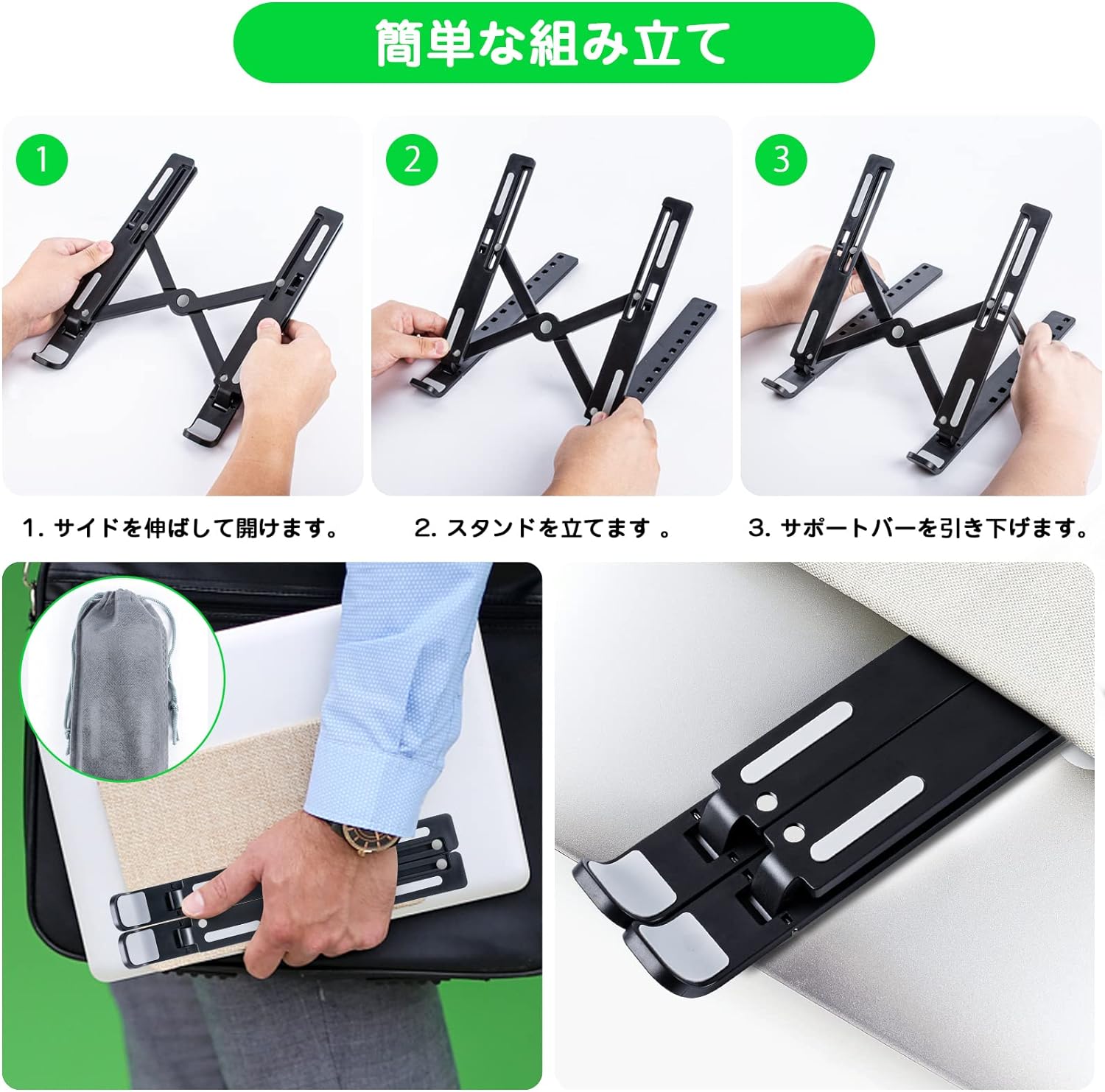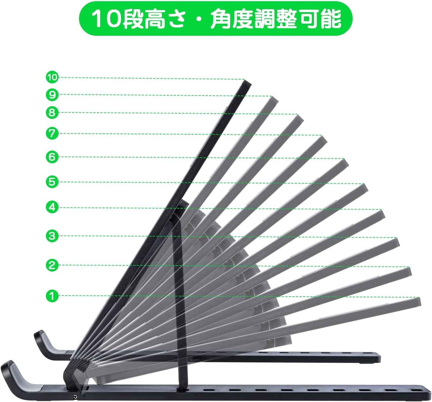 ノートパソコンスタンド ABS製 タブレットスタンド パソコンスタンドPCスタンド軽量ノート人間工学設計 10段高さ・角度調整可能 折りたたみ式 ラップトップスタンド 16インチ以下対応 滑り止め ブラック 収納袋付きM-acbook/M-acbook Air/M-acbook Pro/i-Pad/ノートPCなど7-16インチまでに対応