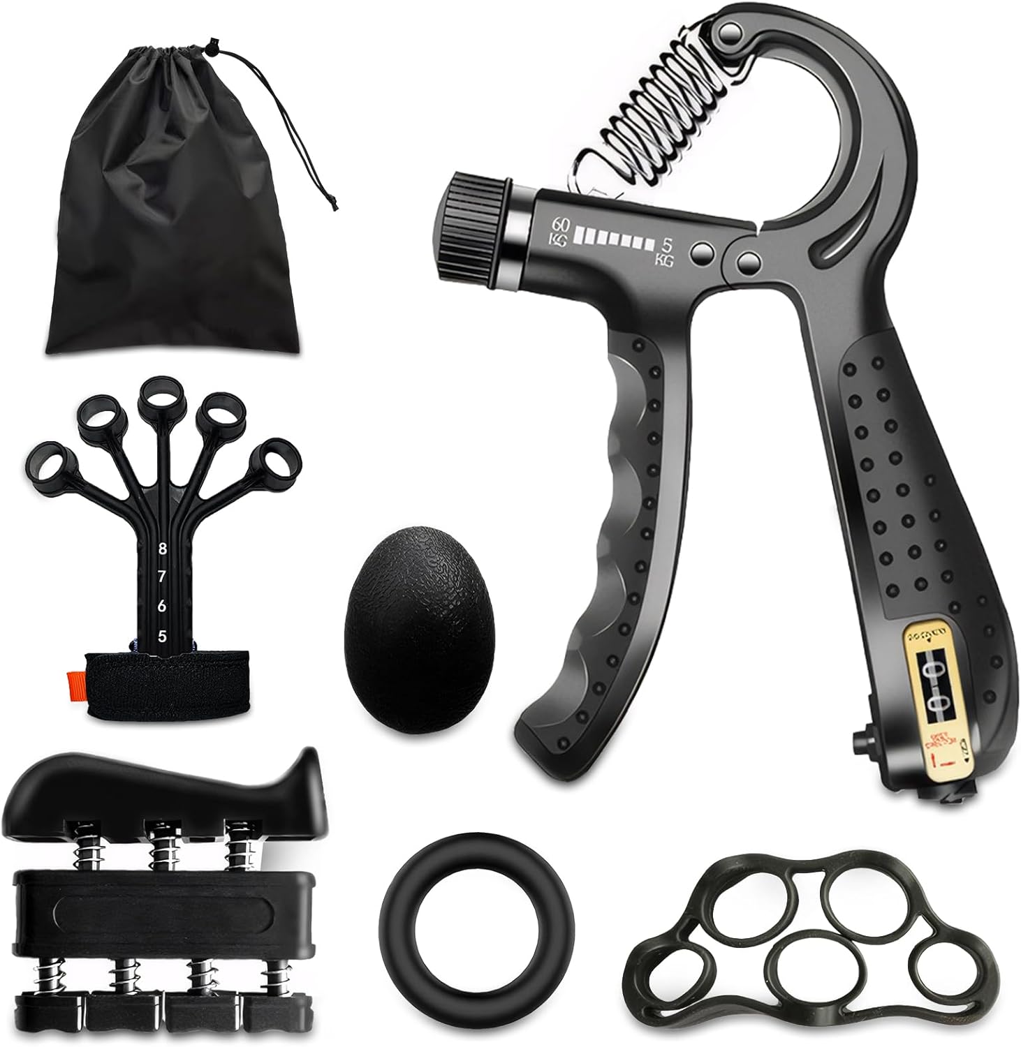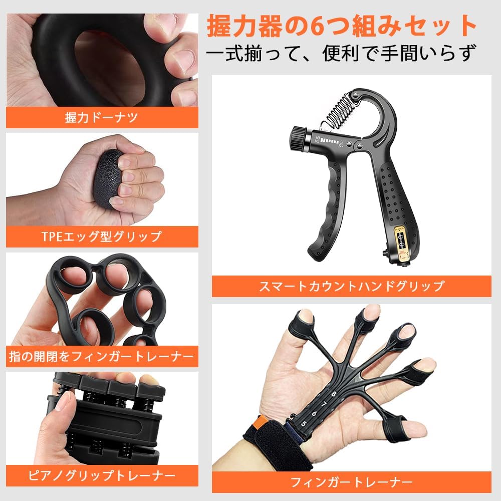 【多機能で収納が便利】ハンドグリップキットには手力を強化するために必要なすべてのアイテムが含まれています。6種類の異なるタイプのグリップトレーニング器具があります:スマートカウントハンドグリップ*1、握力ドーナツ*1、TPEエッグ型グリップ*1、指の開閉をフィンガートレーナー*1、ピアノグリップトレーナー*1、フィンガートレーナー*1。さらに、このキットはコンパクトで軽量な設計で、便利な収納袋も付属しています。すべてのアイテムを整理し、持ち運びと収納を容易にします