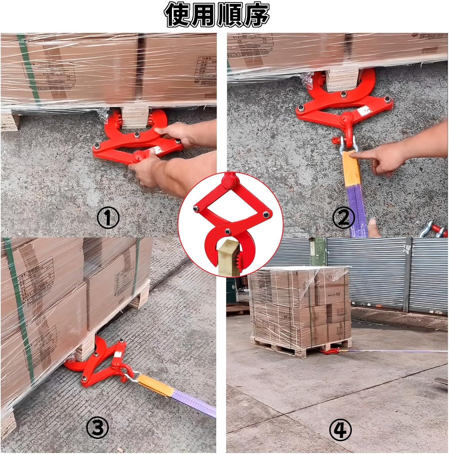 強力なクランプ力:吊りクランプは頑丈なスチール製で、ジョーには鋭利なスチールの歯が10個あり、緩んだり落ちたりすることなく1トンのパレットを確実に保持できます。
