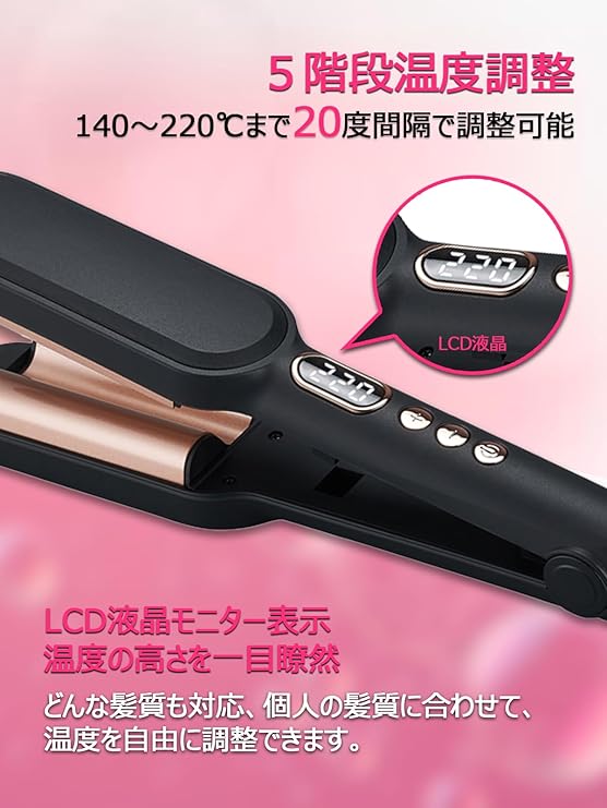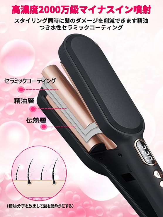 • 【ヘアカールアイロン&初心者さんも10分だけスタイリング】このウェーブアイロンは熱伝導に優れたプレートと特有のコーティング加工を採用することで、熱伝導率に優れ、予熱温度をおよそ45秒で達成!カールヘアアイロンが挟むだけで綺麗なウェーブの髪型を実現できます。従来品のカールアイロンより操作簡単、不器用さんも短時間でふんわりとしたカールが作れます。忙しい朝でも大活躍!410gだけの重量ので途中で手が疲れないです。旅行にも持ち運びできます。🎁『プレゼントキャンペーン開催中』キャンペーン期間中ご注文いただきこと、プレゼントがもらえる!!説明書の連絡先より弊店までご応募ください。