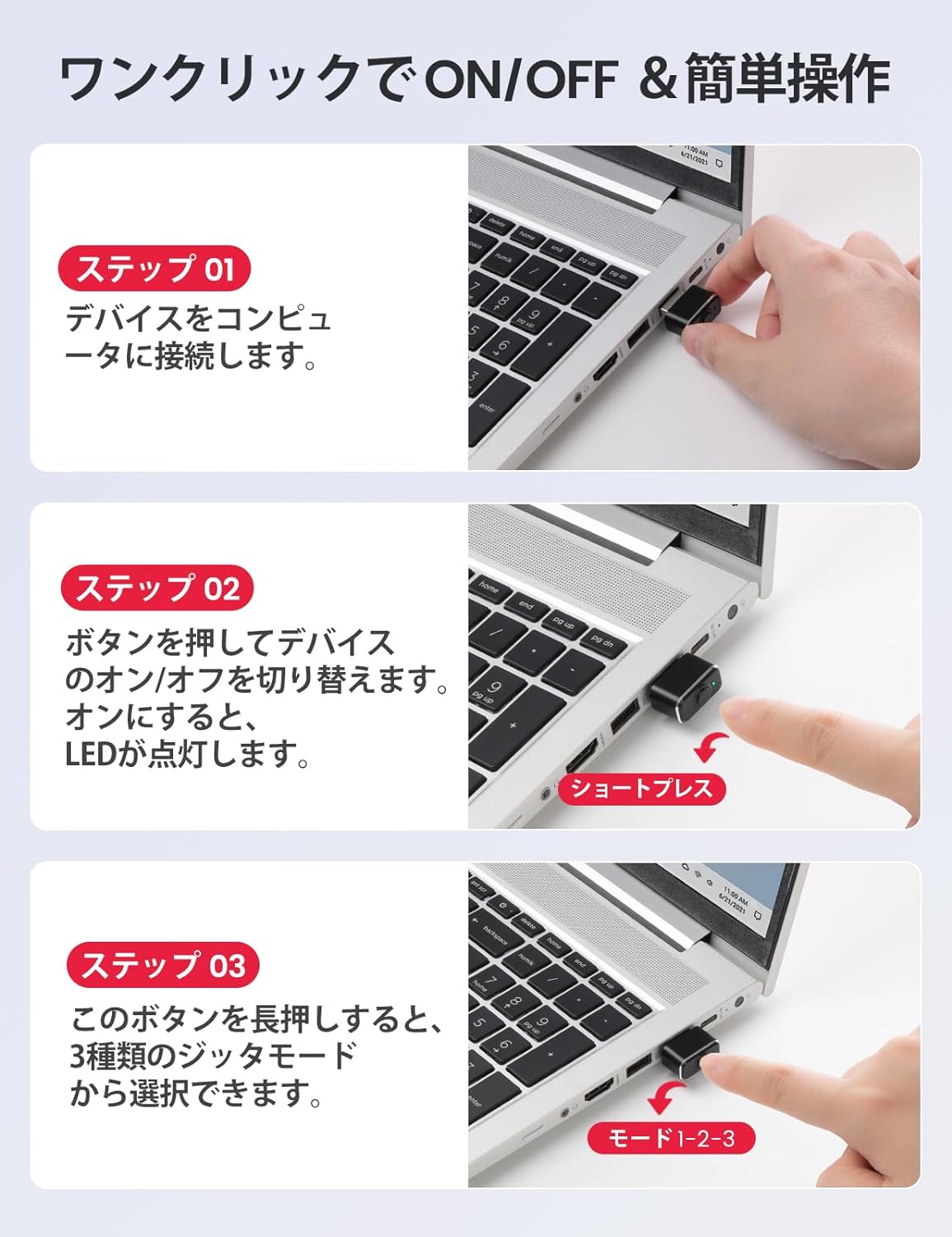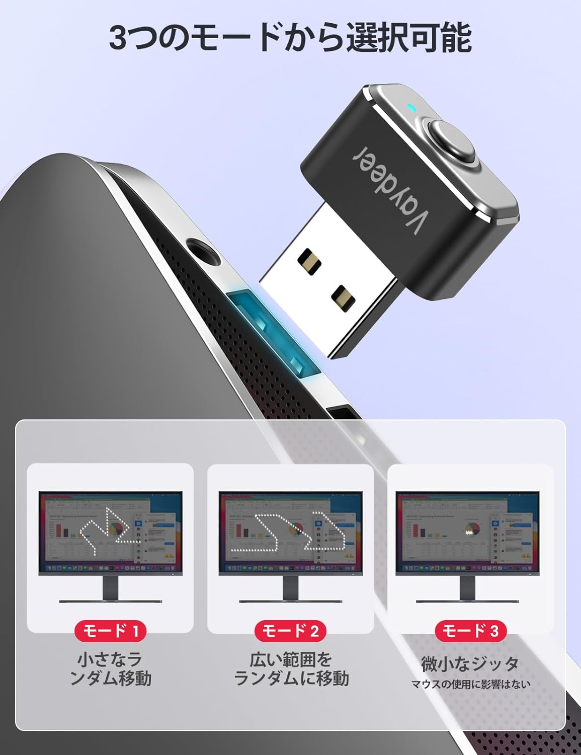 ON/OFFスイッチ付きプラグアンドプレイ: このメタルマウスジグラーは、ドライバーを必要とせず、プラグアンドプレイで動作します。あなたの会社のITは何も検出しません。また、ドライバ不要のため、プラグの抜き差しを繰り返す必要がなく、ON/OFFボタンを押すだけで電源のオン/オフができます。