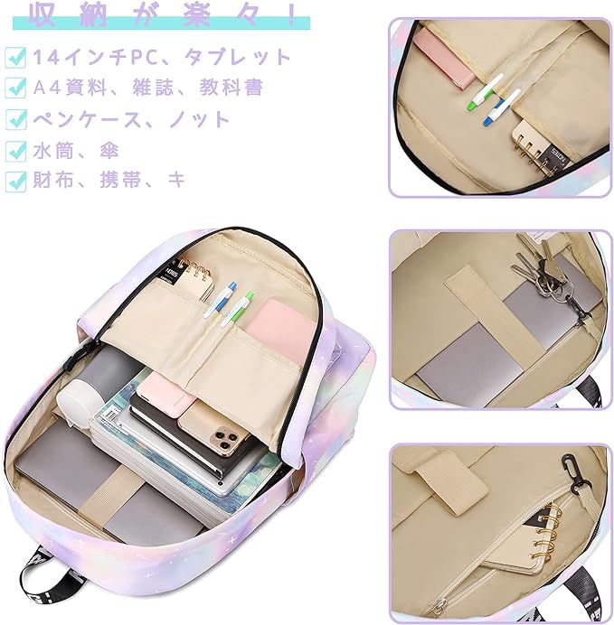 大容量 – A4サイズの資料、14インチのPC、教科書、ノット、水筒、財布など必要なものを全部このバックパックの中に収納できます。
