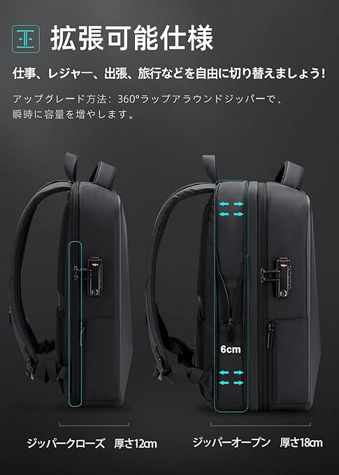 拡張可能な大容量ハードシェルリュック】サイズ:32 * 12~18 * 45 cm、重量1.3kg、容量18〜26L、拡張ジッパーを開いて容量を26Lまで大きくします。ノートPCコンパートメントは最大15.6インチのラップトップを収容でき、iPadコンパートメントは最大9.7インチのiPadを収容できます。学校、オフィス、出張などでの使用に最適。良質のビジネスリュックです。