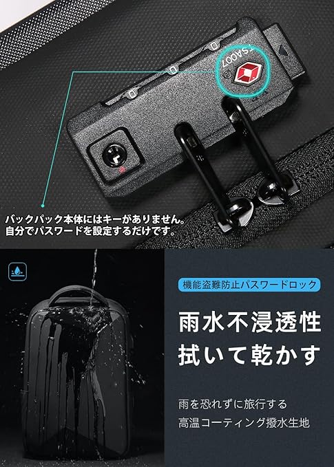 • 【USB充電ポート&パスワードロック】USB充電ポートと充電ケーブルを装備しているので、歩きながら携帯電話やiPadを充電できます。リュックサックのパスワードロックはキー不要です。パスワードを設定すると持ち物を盗難から保護します。リュックのショルダーストラップにはストラップが付いているので、バックパックをスーツケースにしっかりと固定して持ち運ぶのに便利です。