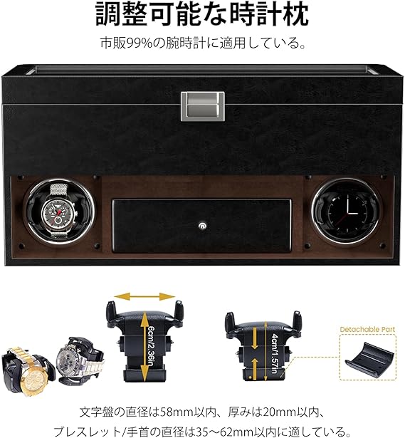 - 📻「伸縮式時計枕」–付属する時計枕にはクッションのサイズを調整可能で、文字盤の直径は58mm以内、厚みは20mm以内、ブレスレット/手首の直径は35~62mm以内に対応します。調整可能な時計枕は時計をしっかりと固定し、男女を問わずあらゆる時計に適しています。