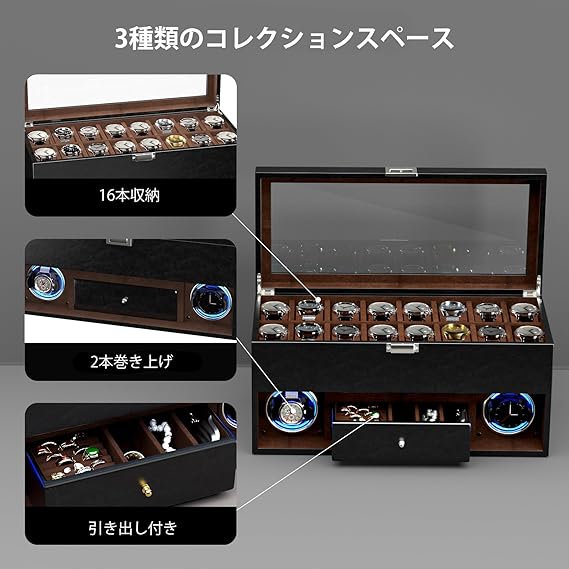 - 「2024年新型のワインディングマシーン」–2本の自動巻き時計を巻き上げ、16本の時計収納スペースとジュエリー引き出しを備えたコンパクトなサイズで、最大の実用性を提供します。個人使用にもプロのコレクターにも最適なこのウォッチワインダーは、機能性とエレガンスを兼ね備えた包括的な製品です。また、耐久性もあり、ご愛用な時計の長期的なケアへの投資です。