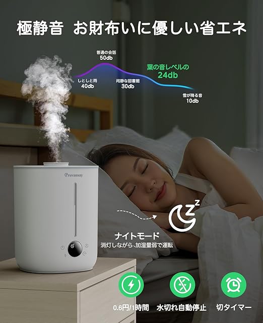 【湿度可視・加湿量知能調整・LEDタッチパネル】2.8L大容量タンクを搭載した超音波式の加湿器で、一回給水で26時間の連続使用が可能です。湿度センサーが内蔵されており、状況に応じた運転に切り替わってくれ、知能的に湿度を設定目標の40%~80%RHに保て、過加湿状態による結露とカビを防ぎます。ミストを弱・中・強の3パターンで調整、お好みに合わせて加湿していただけます。最大300mL/hの加湿量で、お部屋の隅々まで効率的に加湿、広大な部屋でもムラなく隅々まで迅速にしっかりとうるおします。また、子供と老人でも易くて直観的に操作可能な視認性の高いデジタル表示パネルが付き、現時点の部屋湿度をひと目でチェックしながら、秋、冬に向かうにつれて、部屋の乾燥具合に合わせて快適な空間を簡単に作りましょう!