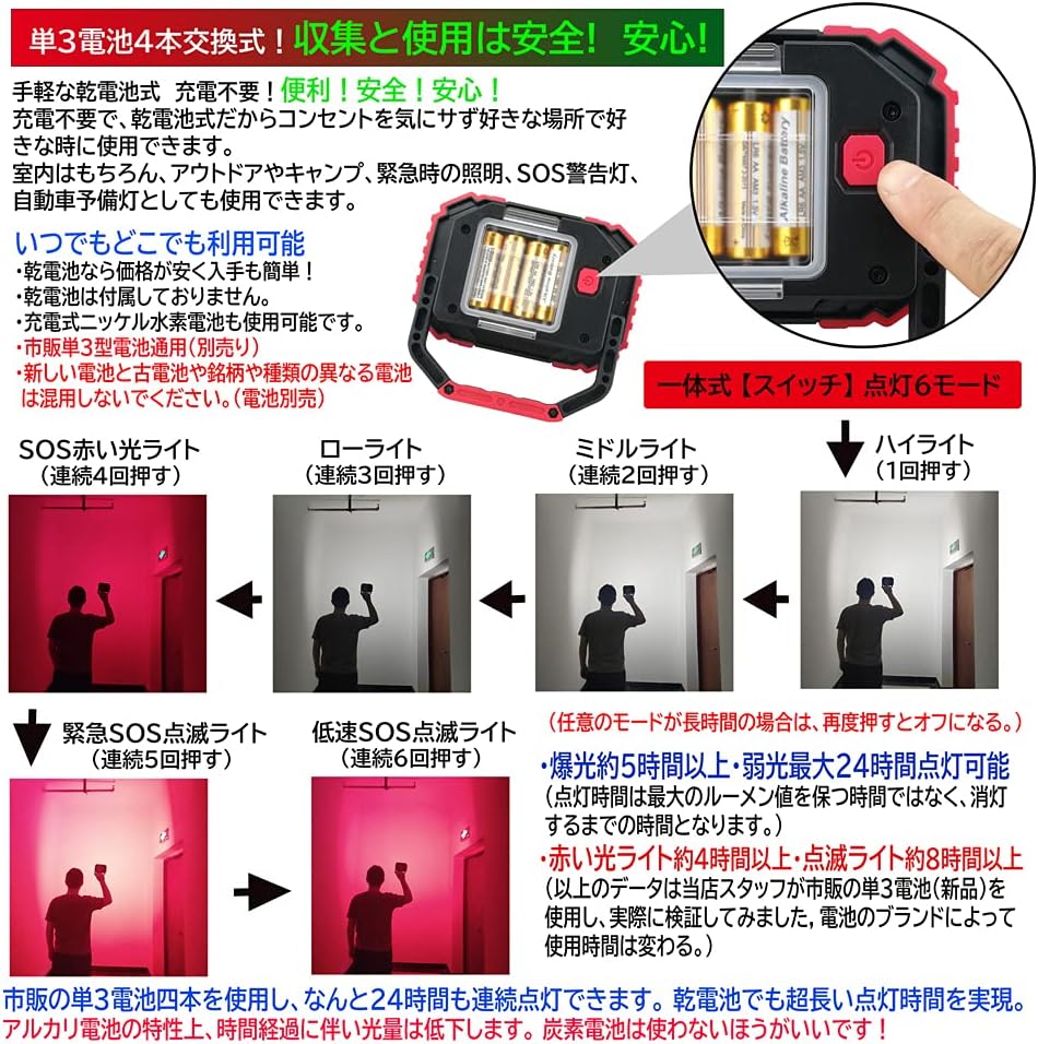 cob投光器単3電池式は赤い光モードを追加して、災害や緊急救助に大活躍!地震防災停電対策として非常用商品。