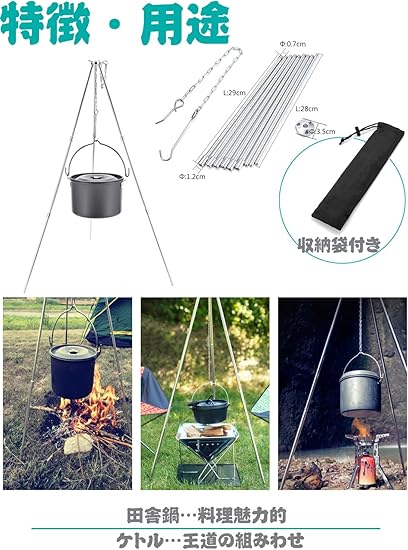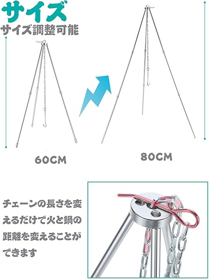 - 【三段式・高さ調節可能】上部のピンでチェーンの長さを変えることで火との距離を調節できます。使用場合により、1~3段式にも自由に変更可能!