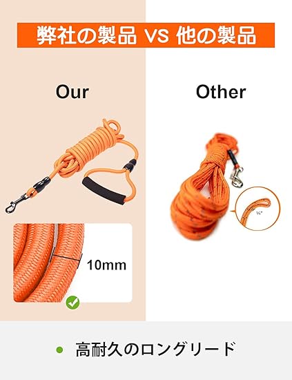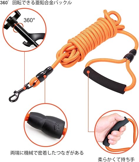 - 【丈夫な牽引ロープ・丸ロープ リード】このロングリードは高密度ナイロンで編んであって、柔軟性、高耐久を実現します。丸ロープは高密度クライミングロープ内芯を利用し、ご愛犬に噛まれません、普段のお散歩からトレーニング・アウトドアまでご利用いただけます。また水に浮く軽量素材なので川遊びなどにも大活躍です!