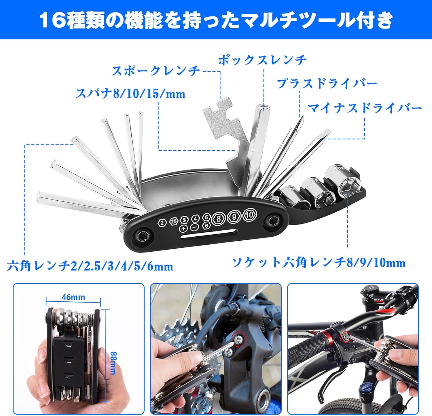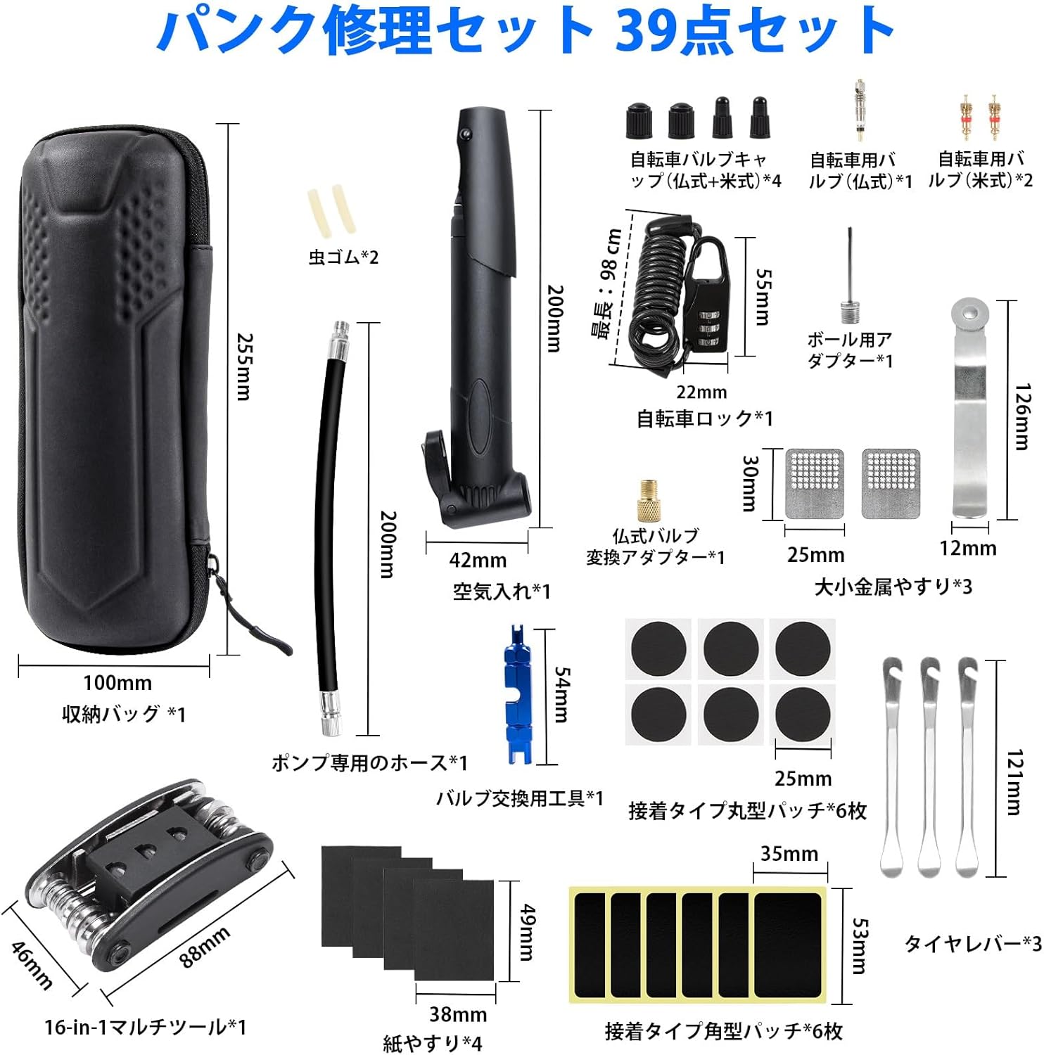 - 2023新登場充実の自転車パンク修理キット:パンク修理キット、空気入れセット、16-in-1マルチツール、自転車ロック、収納バッグ、バルブセット、合計39点が含まれています。自転車修理キットはやはり常備しやすくなっています。ワイヤーロックにもあり、不便な時、サドル、ヘルメットやその他の貴重品は、自転車のハンドルや後部座席に一時的にロックすることができます。いつでも対応できるので、安心です