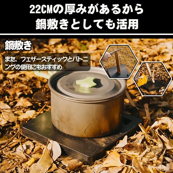 - 【多機能の使い方】真ん中に深さ5mm、直径76.5mmの穴が掘りこんでおり、専用薪割りクサビがピッタリはまることができ、安定性が抜群です。ひっくり返した反対面は薪割り台としてはもちろん、バトニングの使用や火を起こすためのフェザースティックを作るにも利用できます。また、鍋敷きにもなり、かなり実用的なギアです。