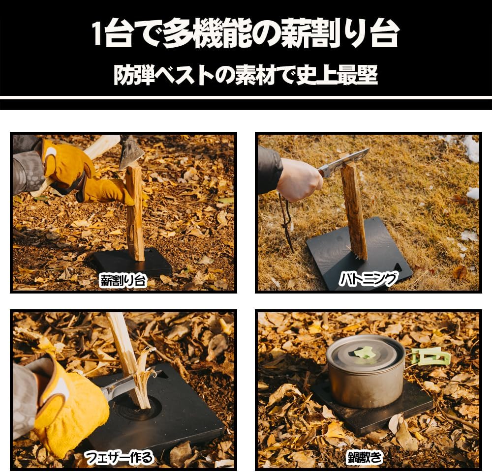 - 【多機能の使い方】真ん中に深さ5mm、直径76.5mmの穴が掘りこんでおり、専用薪割りクサビがピッタリはまることができ、安定性が抜群です。ひっくり返した反対面は薪割り台としてはもちろん、バトニングの使用や火を起こすためのフェザースティックを作るにも利用できます。また、鍋敷きにもなり、かなり実用的なギアです