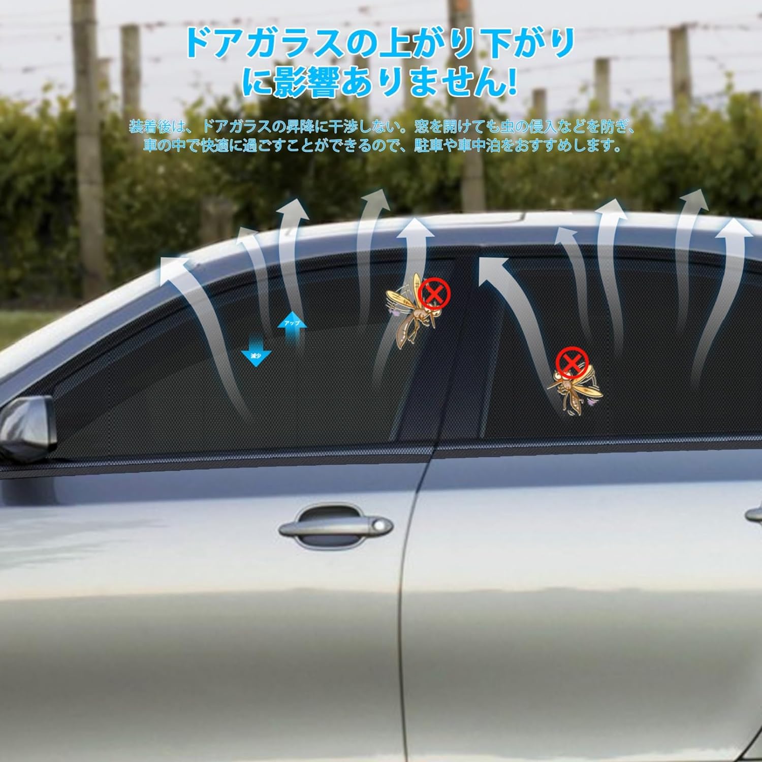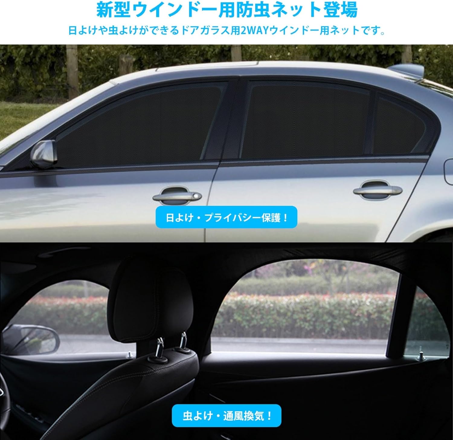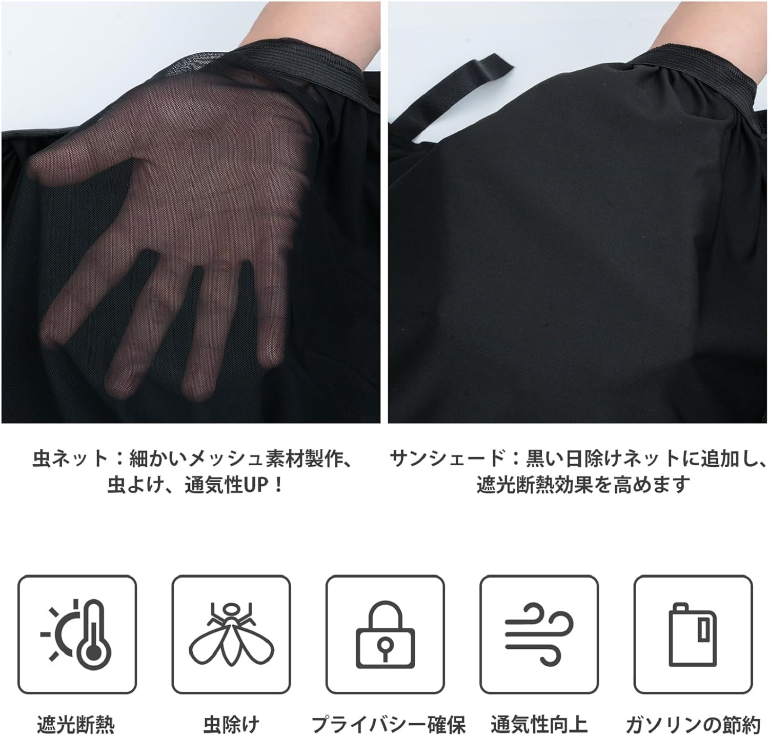 新型ウインドー用防虫ネット登場】車用日よけ及び虫よけ2in 1を結合したウインドー用ネットが2023新登場!虫除けネットの基礎の上に黒い日除け面を追加し、二重構造で、風通し、防虫効果がよく、遮光効果もさらに向上した。外部からの熱やUVも大幅にカットしてくれ、駐車しながら冷房と合わせて使うことで効率性も向上してくれます。なお、夜が来ると、内側日除けネットはファスナーで開けて、窓を開放し、涼しい風を入り、車中で快適に過ごすことが出来。