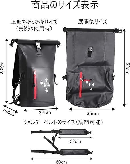 【大容量収納】 本体は仕切りのない構造なので、大きな物でも楽々収納。容量を無駄なく使う事ができます。内部は25Lのスペースがあるから、衣服、財布、スマホ、水筒など色々な外出の用品を全部まとめて!25Lは水を入れて概算した容量ですが、実際の使用では容量誤差の可能性があります。具体的なバックパックの容量については、製品画像に表示されている実際に測定された製品サイズをご参照していただけます。商品展開後サイズ:58cm*36cm、上部を折った後サイズ(実際の使用時):48cm*36cm