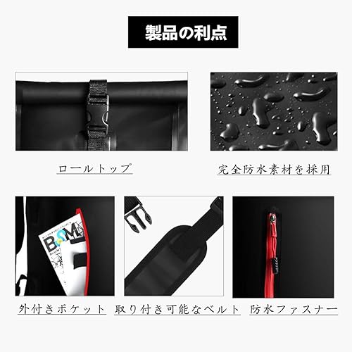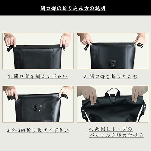 【防水力抜群】 開口部を丸めて巻くことで、上部からの浸水を防ぎます。そのうえで、縫い目は浸水しやすいポイント。生地を特殊加工で縫い目なく圧着し、防水性能だけでなく高い耐久性を実現しました。バックルを外したら簡単に開けることができます。