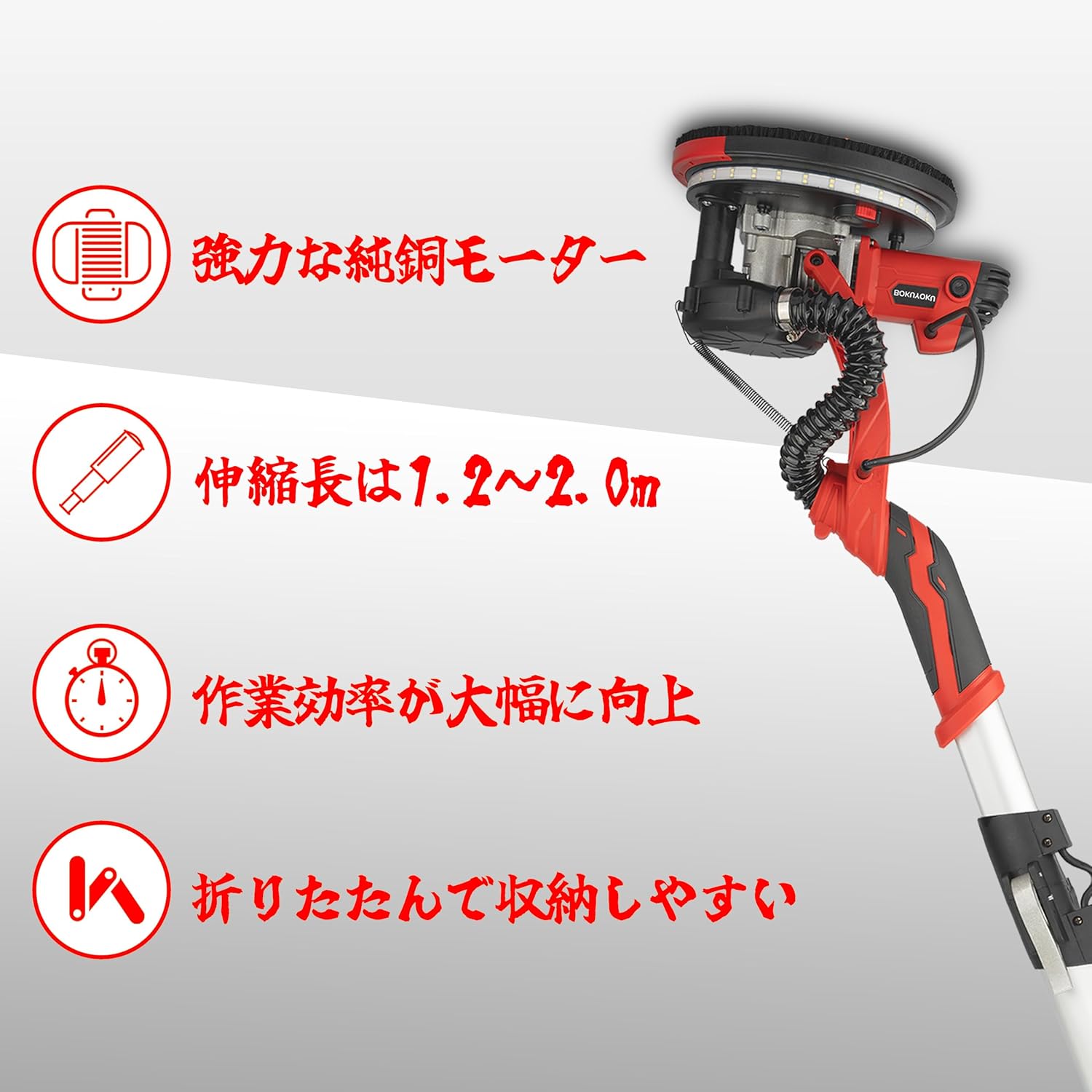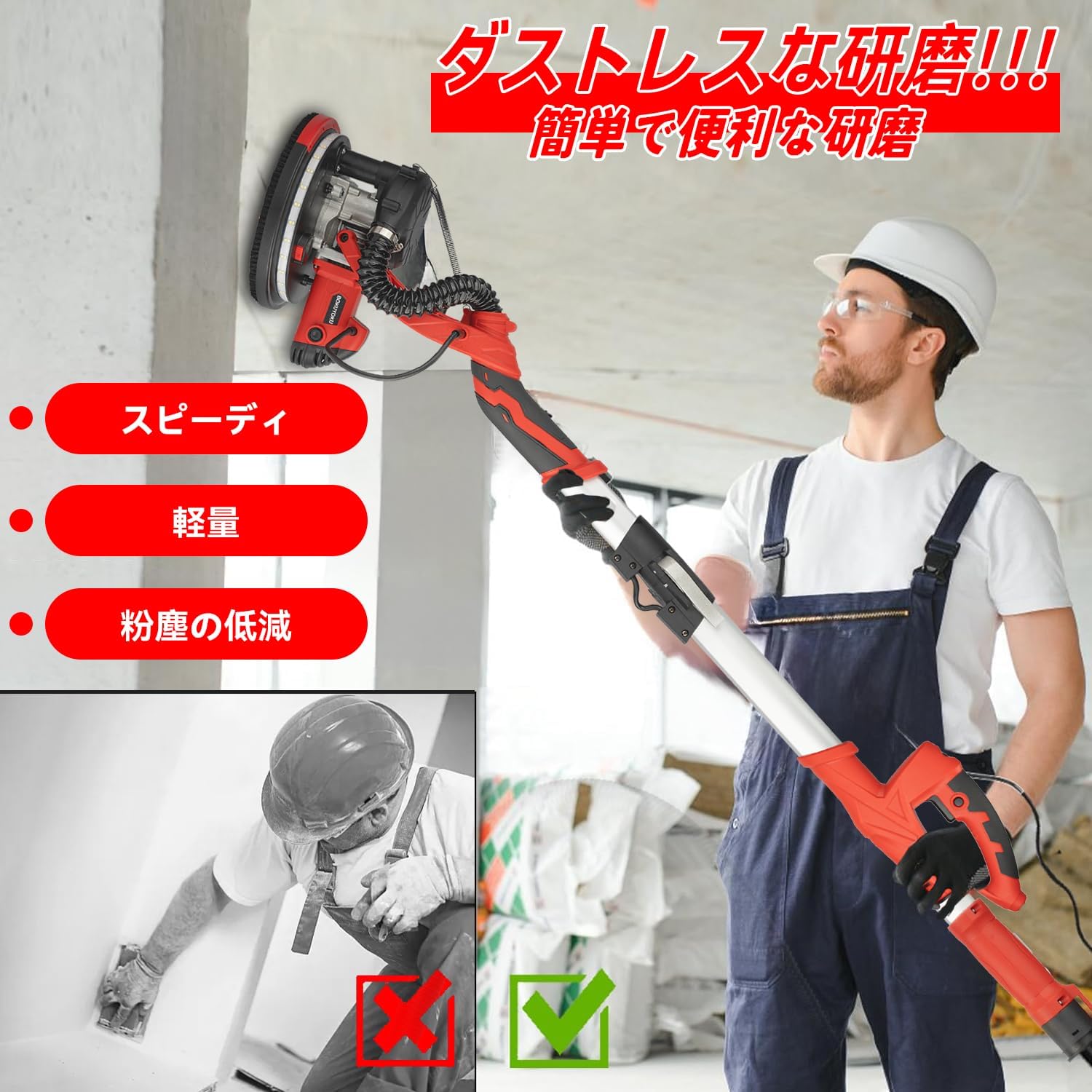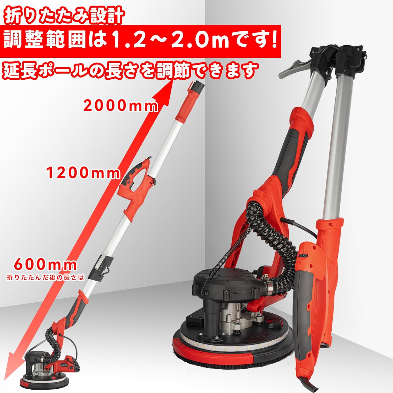 • 調整可能なハンドルとLEDライト:電気ドライウォールサンダーは二重のLEDライトを備えており、360度の照明を実現します。暗い環境でも正確な研磨が可能です。延長ポールは1.2メートルから2メートルに調整でき、高い壁や天井の研磨がより容易になります。