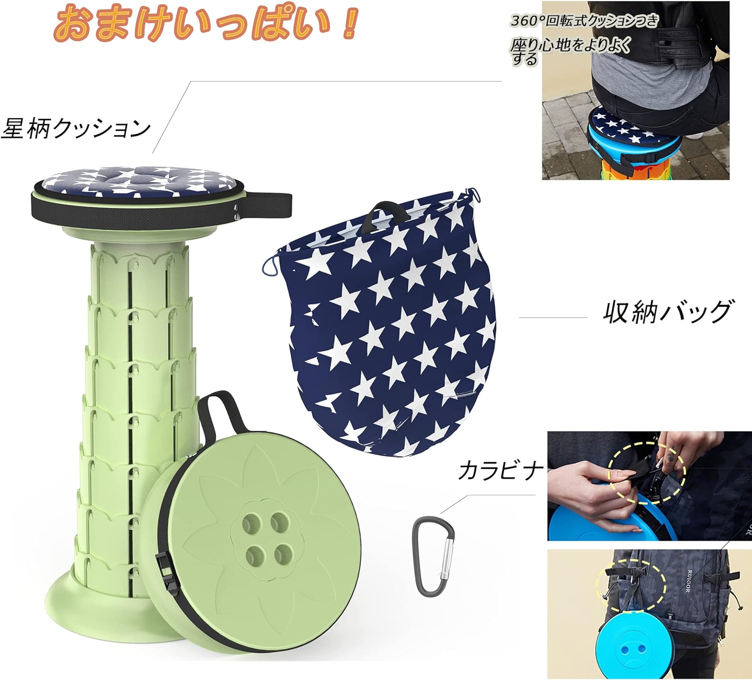 【使い方超簡単・耐荷重200KG】●収納するときは逆方向に少しひねりを入れながらスツールの両端を押すだけで一瞬で収納可能。●伸縮式チェア本体は1kgしかないにもかかわらず、頑丈なABSとポリアミドを採用したので、最大荷重は200kgにも達しています。軽量で携帯しやすくて、構造も安定しています