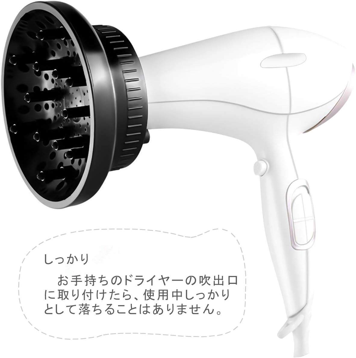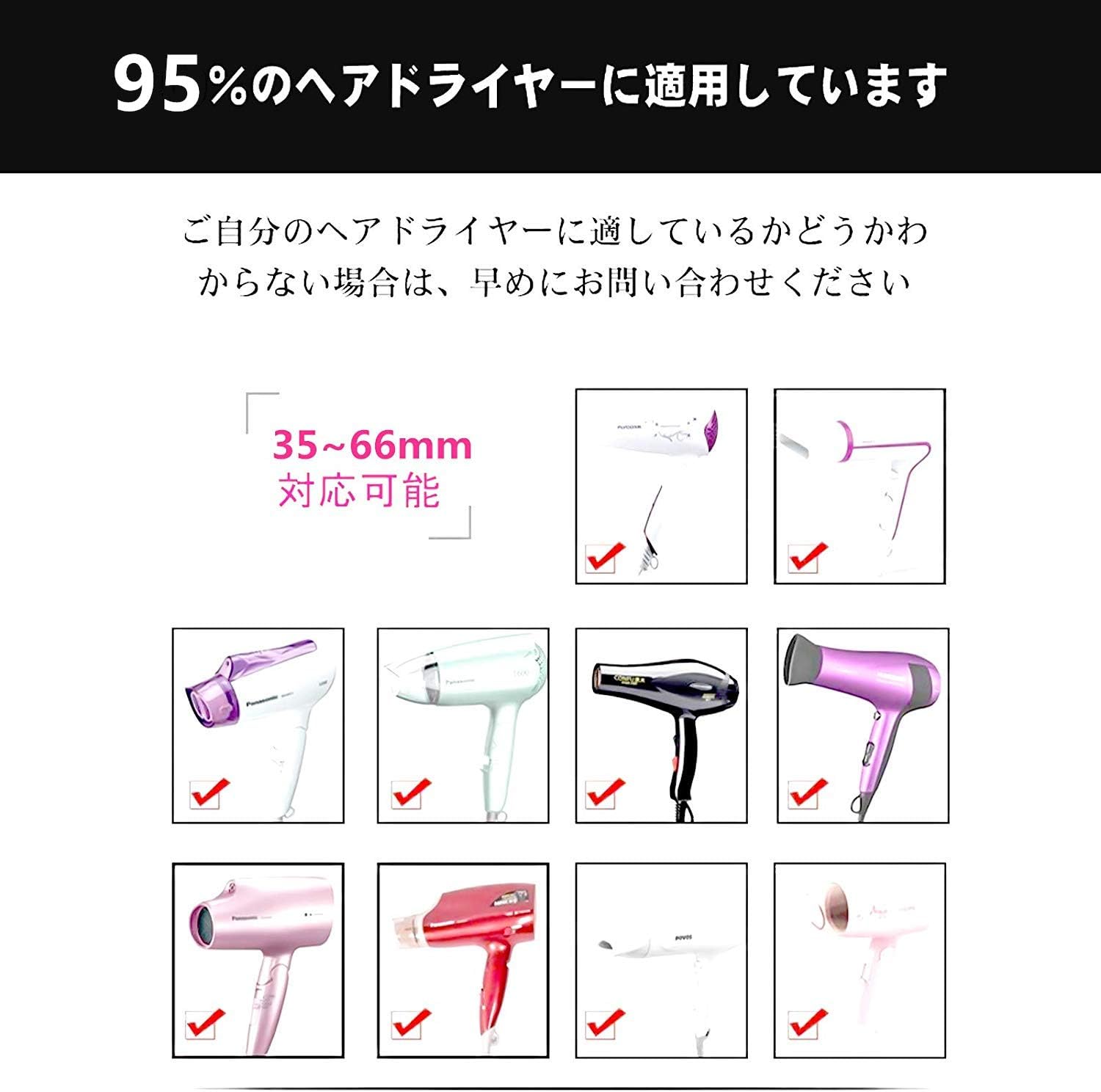 【通用ディフューザー】市場におけるヘアドライヤーの95%以上の異なるデザインに適応可能です。ディフューザーの口の直径が調整可能で、35〜66mm吹き出し口のヘアドライヤーに適しています。