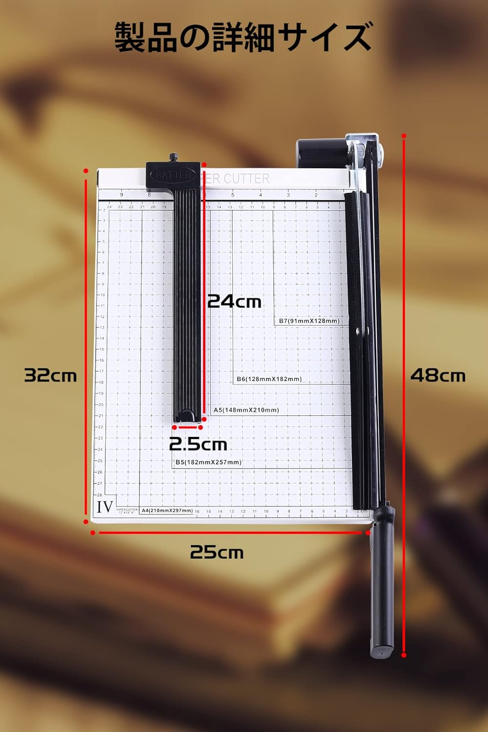 【商品仕様】 サイズ:縦32cm、横25cm、持ち手付き刃 長さ48cm 【付属品】ペーパープレス、位置決め定規 【裁断対応サイズ】B7/B6/A5/B5/A4対応 【最大カット枚数】コピー用紙12枚 【カット可能素材】紙、繊維・プラスチック製品 写真ダンボールなど。