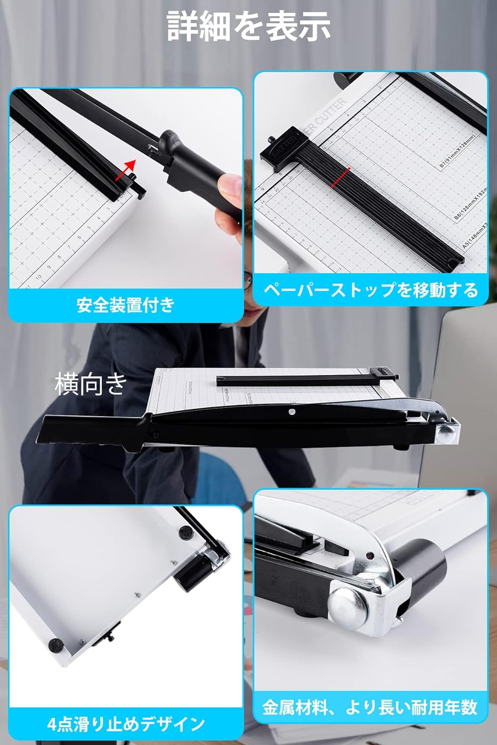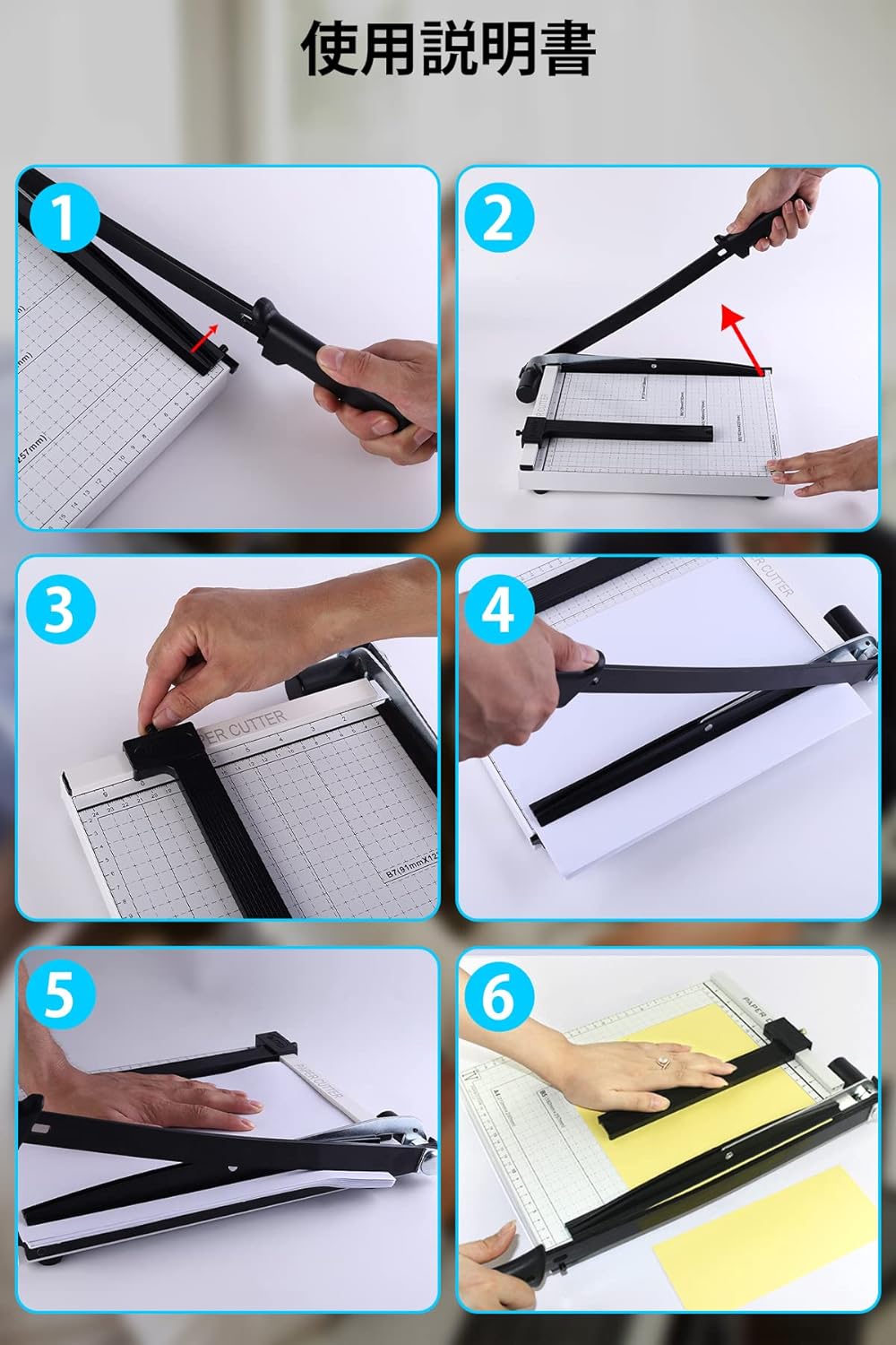 【操作が簡単 オフィスの必需品】裁断機にはプレッシャーバーとペーパーポジショナーが装備されており、カット中に紙が動くのを防ぎ、カットムラを防ぎます。ポジショナーは簡単に分解できるので、長い紙なども簡単に切断できます。紙のカットに便利な1cm単位の目盛りも付いているので、正確にカットできます。 大きさがひと目でわかります。 B7/B6/A5/B5/A4 用紙サイズをより正確にカットします。 誰でも簡単に切れます。
