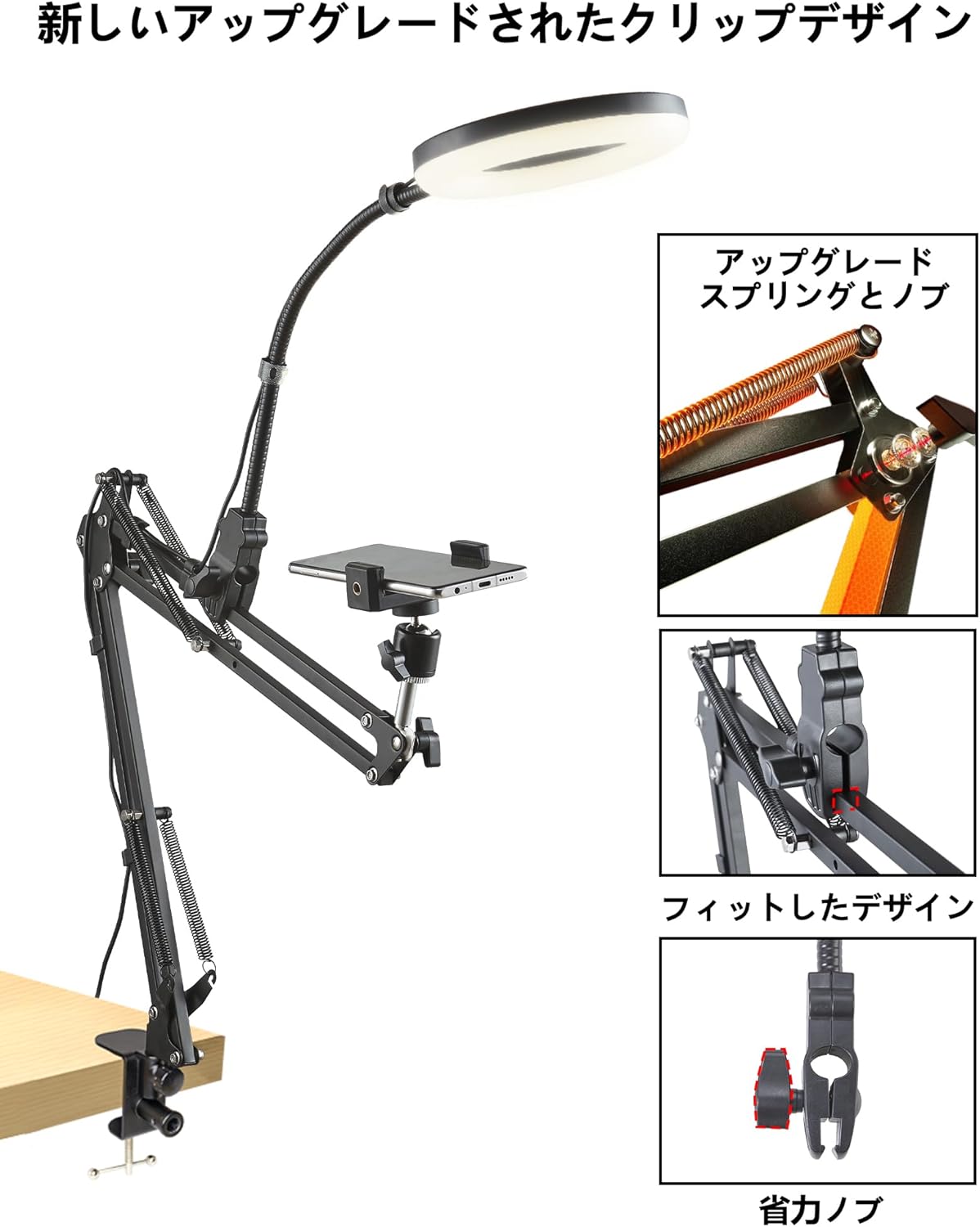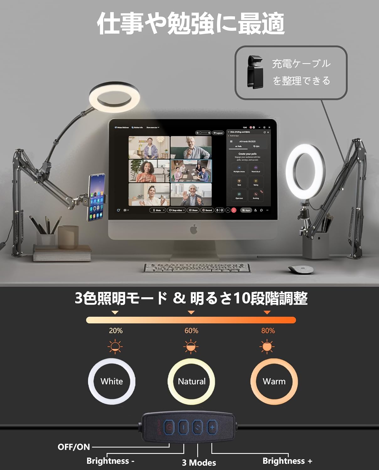 【2024年強化版操作簡単なリングライト】この6インチリングライトは高品質なLEDチューブと高透過率のPCカバーを採用することで、照明対象の色彩をより忠実に再現します。グースネッククリップ設計で、従来のネジで角度調整する手間が省け、取り付けがもっと簡単です。3つの色温度と10段階の明るさを自由自在に調整でき、卓上の照明撮影用ライトキットとして最適です。柔らかな光なので、オンライン会議、Zoom会議、配信など場合に長時間使用しても目の疲れを感じさせません。