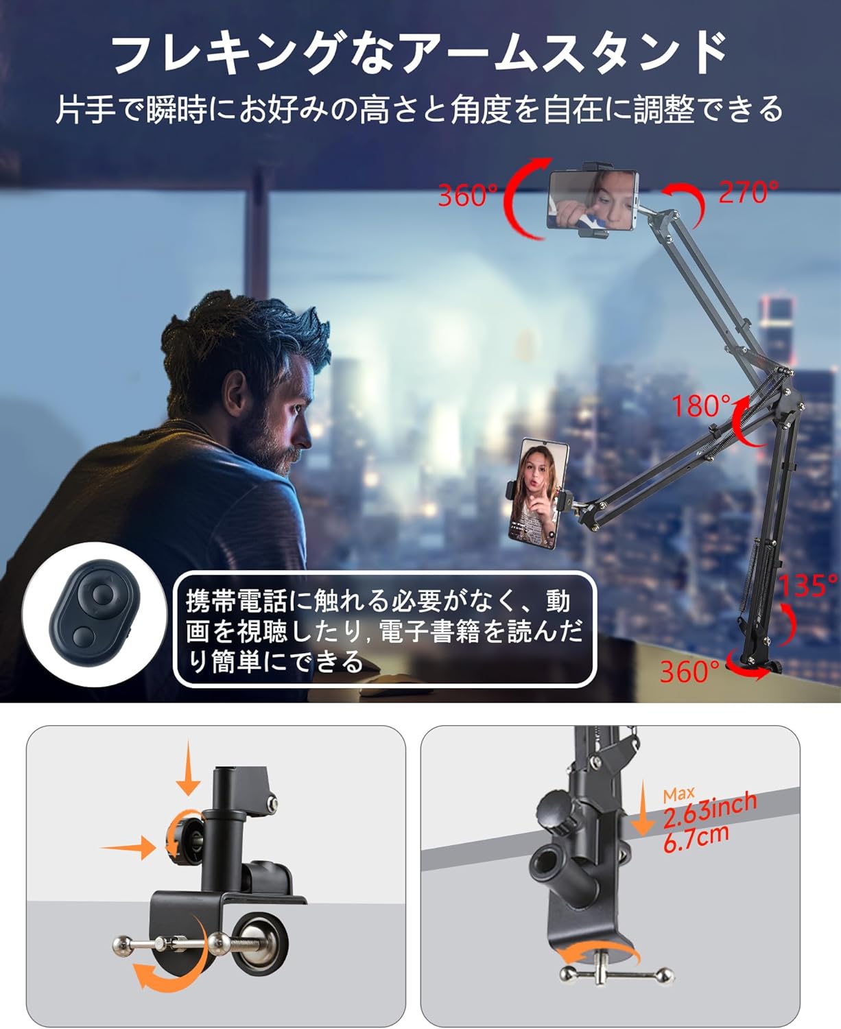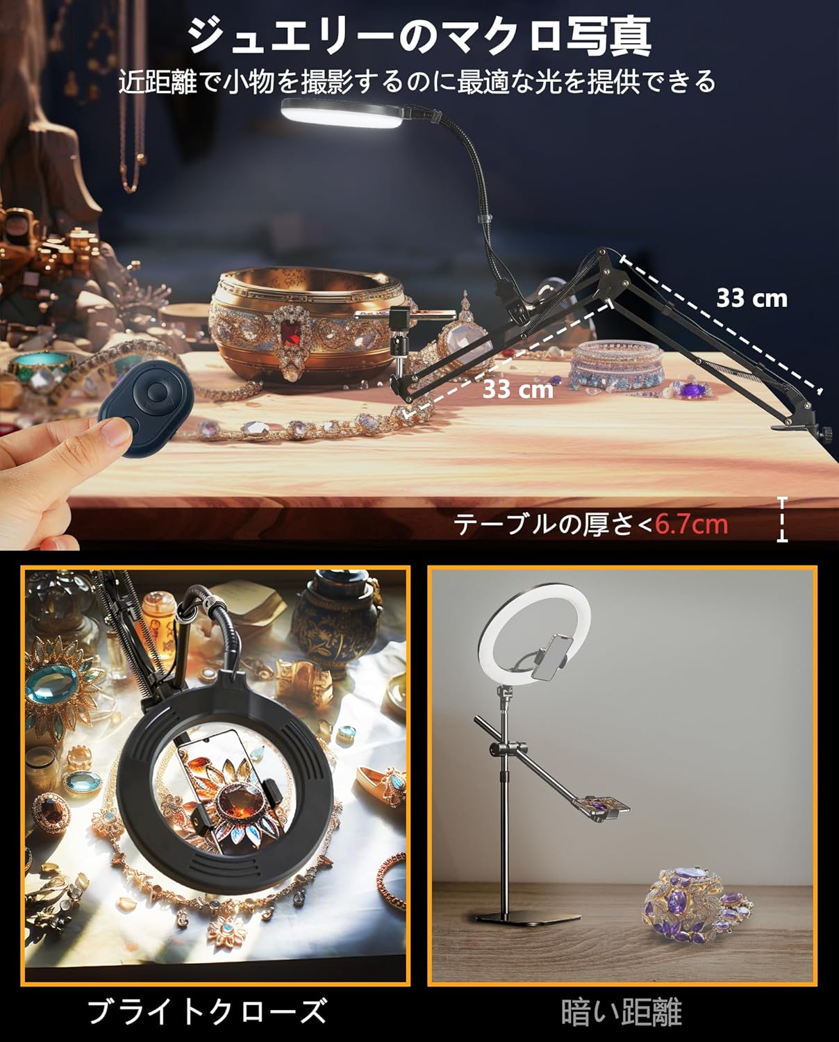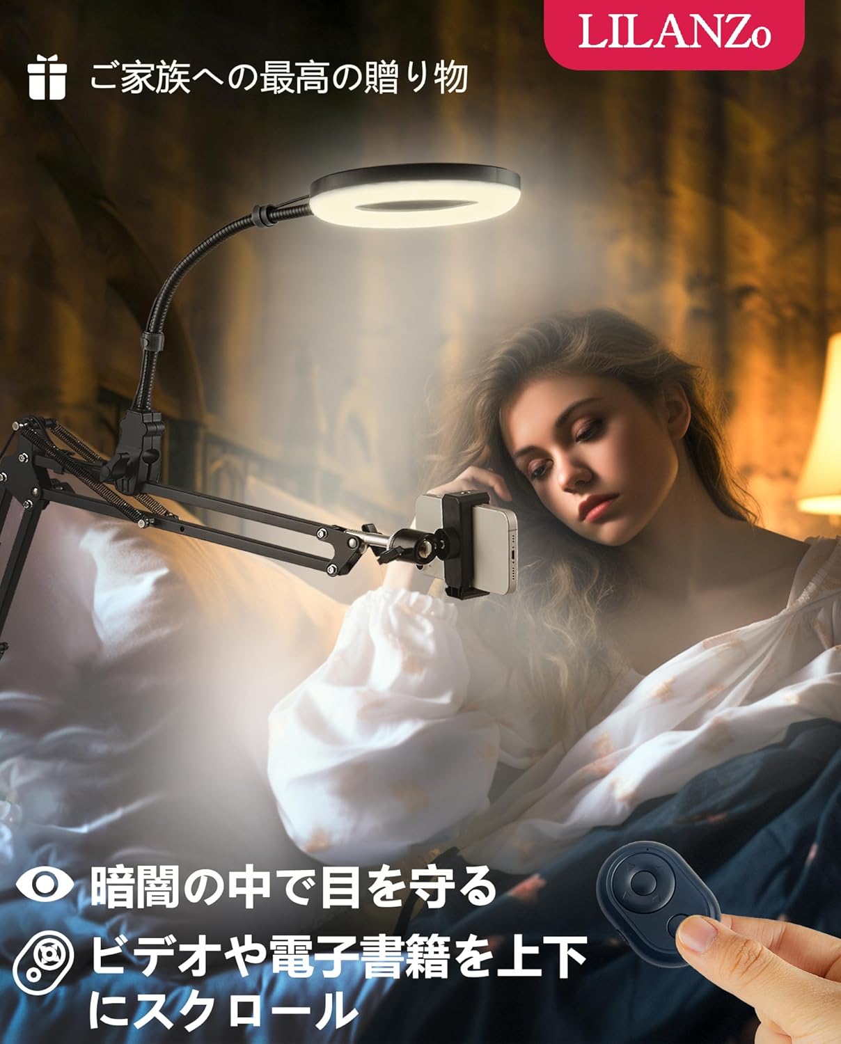 LILANZo リングライト スマホスタンド 俯瞰撮影 アーム式 6インチ LED 照明 撮影用ライト 卓上クリップ式 女優ライト 3色モード 10段階調光 360°回転 自撮りライト ライブ配信 YouTube Tiktok動画撮影 料理/絵画/手芸/授業/美容化粧/LIVE生放送/物撮り/web会議に撮影 スマートフォン用Bluetoothリモコンシャッター付き