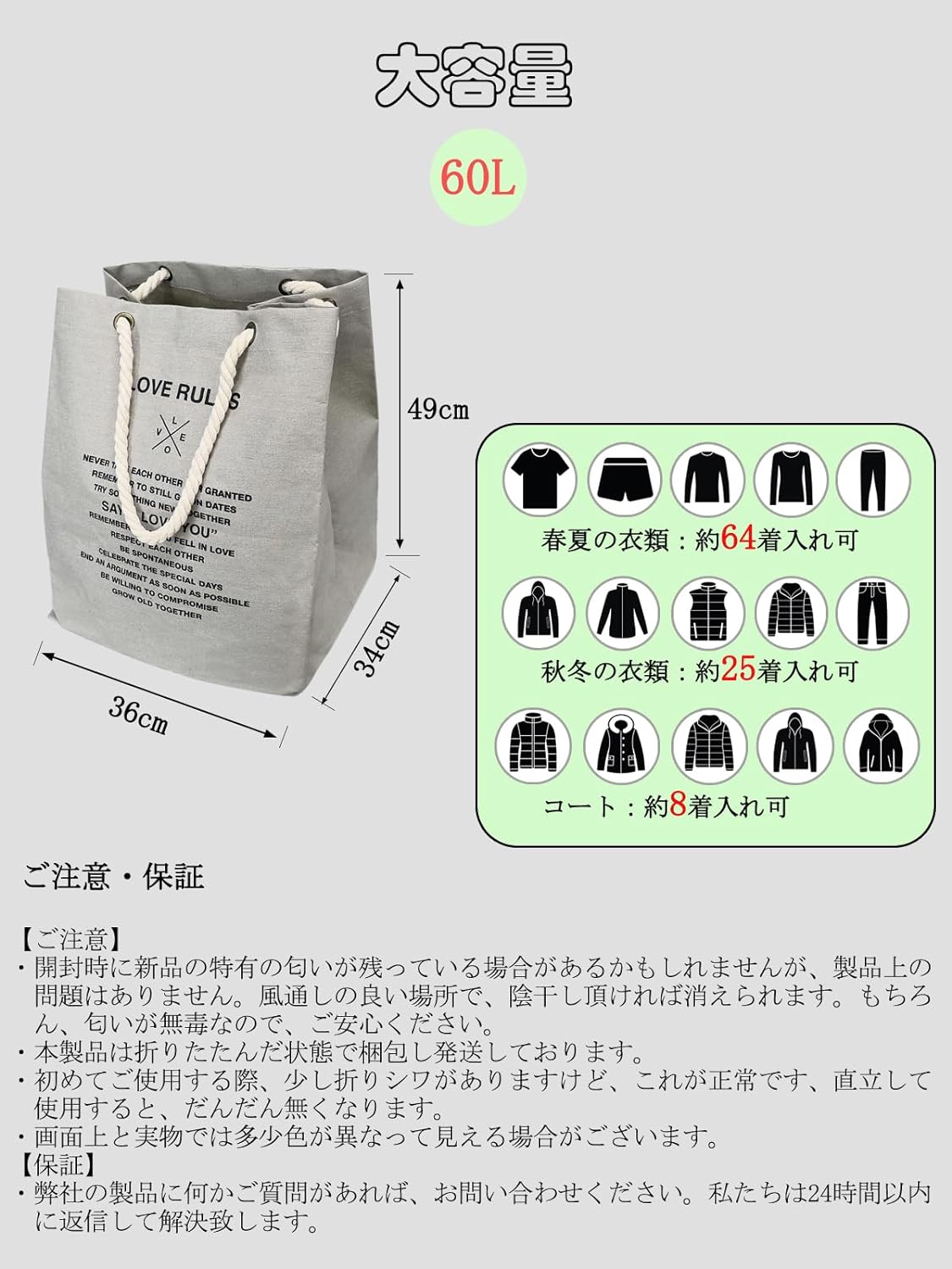 【大容量】60L大容量の洗濯かごは、高さが約49cmで、幅が約34cmで、長さが約36cmです。バスルーム、ベランダ、洗面所、居間などに置いて、たくさんのタオルや衣類を収納することにぴったりです。更にお子様のおもちゃ、おむつ、タオル、衣類、毛布、小物なども収納できます。
