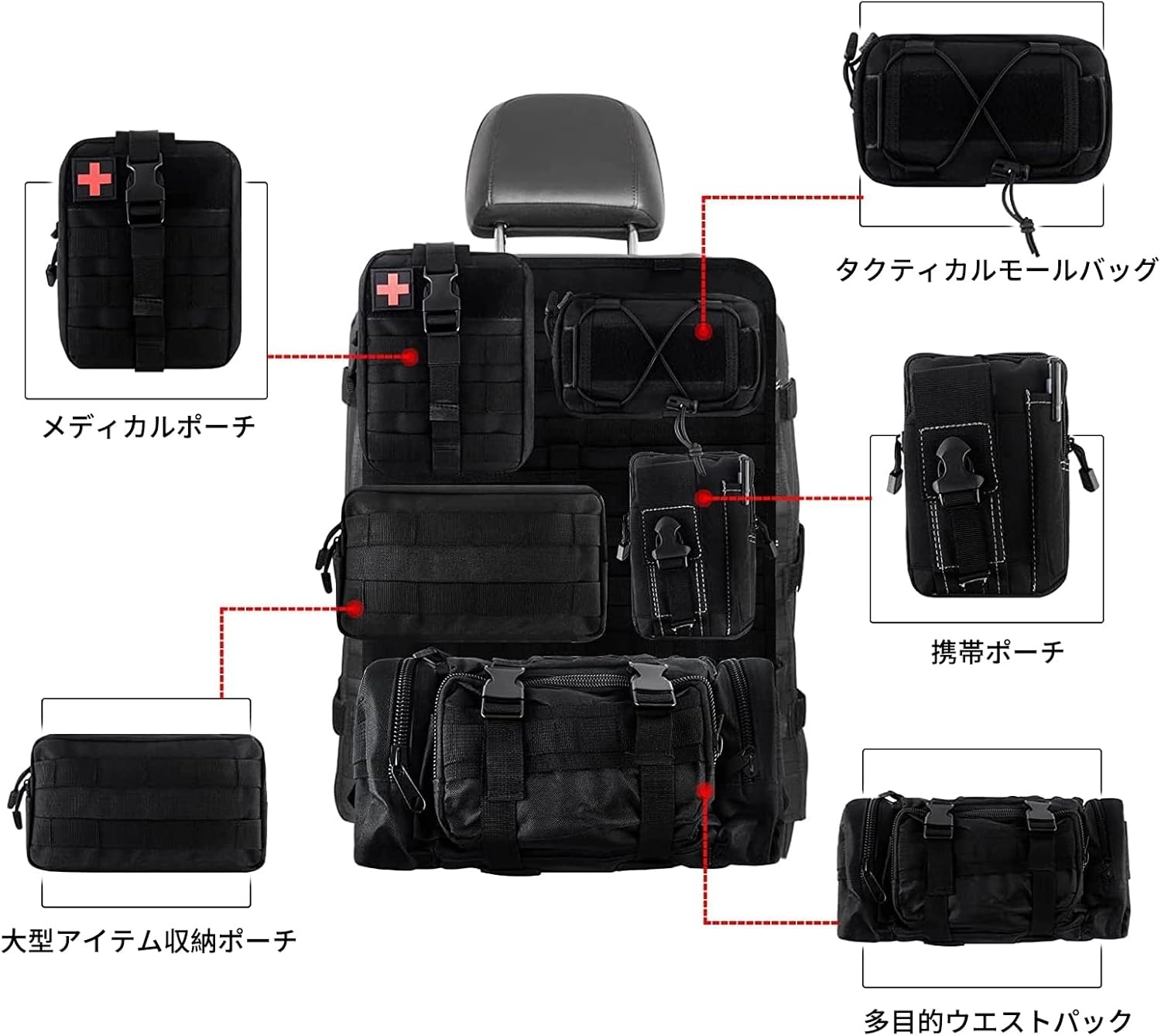 • 5つのバッグを備えたオーガナイザー:複数の収納コンパートメントの車の後部座席オーガナイザーデザインは、本、iPad、および戦術的なギアを保持します。医療用ポーチは、救急用品を保持します。ウォーターボトルポーチはあなたのボトルを保持します。 3つの異なるサイズの管理ポーチは戦術的なギアを保持するか、好みに応じて
