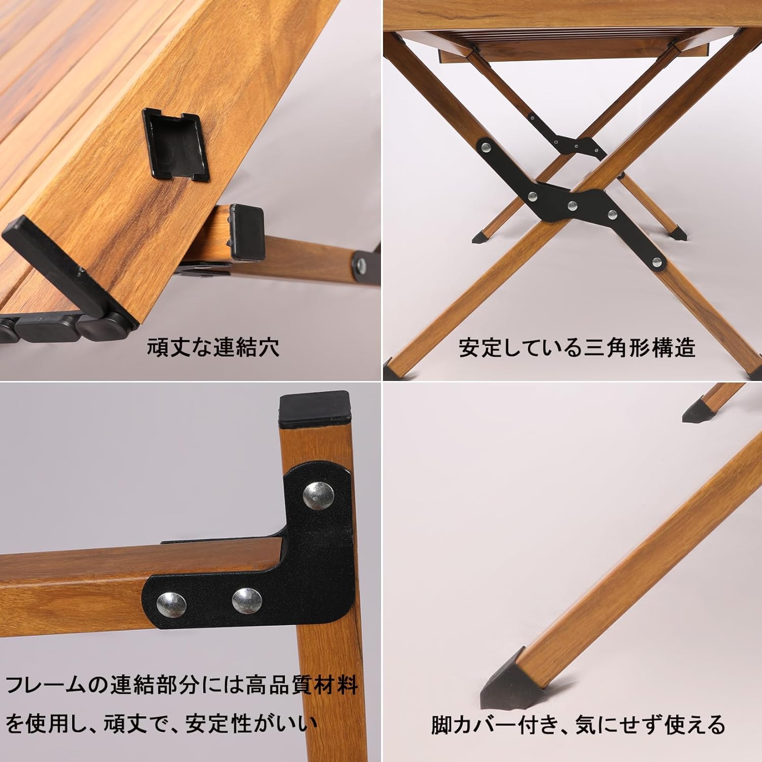 【木色のアルミ製テーブル】外観は美しい木目テーブルですが、全体的に高いアルミニウム合金で作られています。軽量ながらも高い耐久性を持ちます。