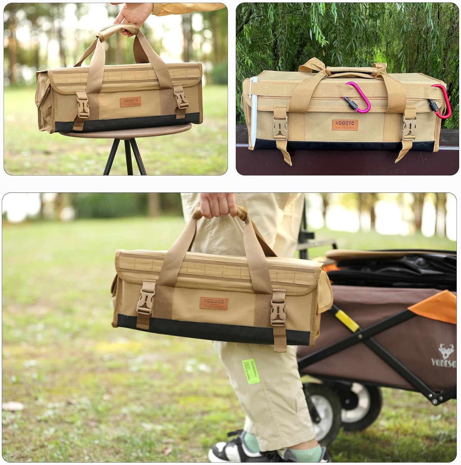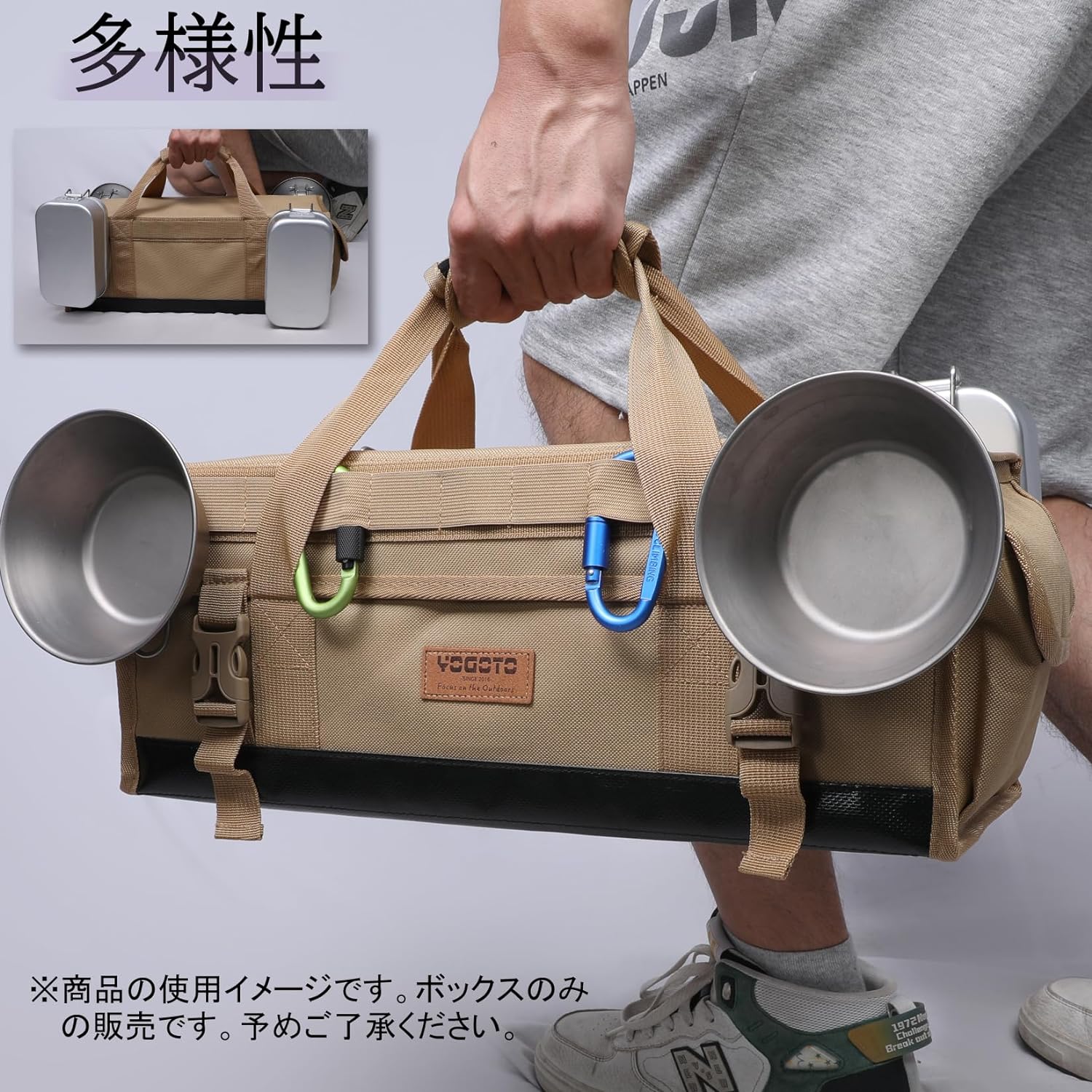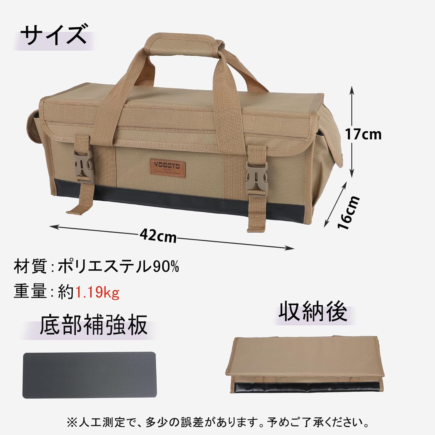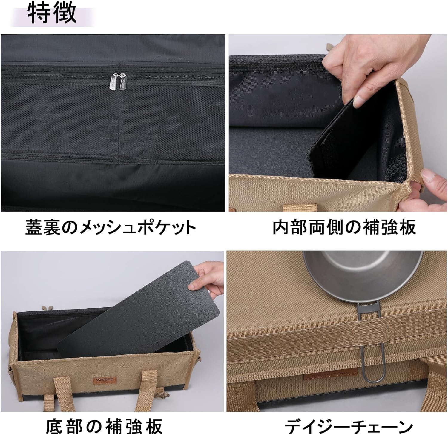 本体材質:600Dポリエステル、ナイロン  底部補強板: PE板(取り外せる)  形状:キャンプ用品を整理しやすい四角い