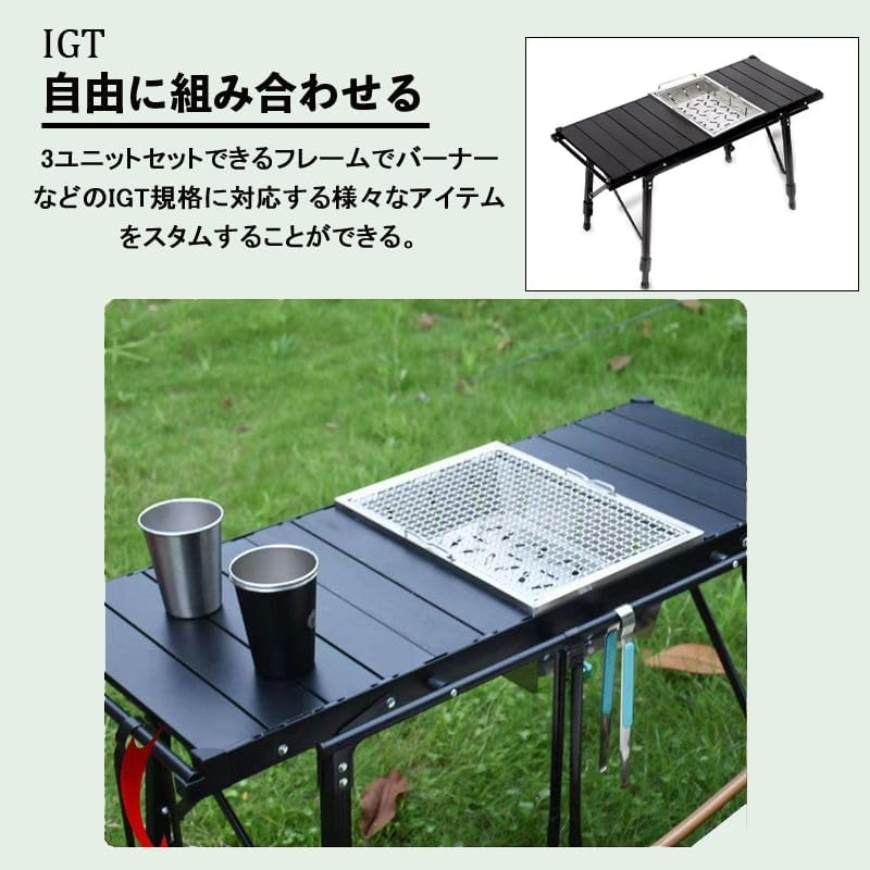 【IGT用で自由に組み合わせる可能】IGT互換テーブルは天板が取り外し可能で、3つのユニットで構成されており、ニーズに合わせて組み合わせ可能です。バーナーや焚き火台、水切りかご、BBQコンロなど様々な用途に対応し、サイドバーを利用して食器やキッチン用品を吊り下げることが可能です。